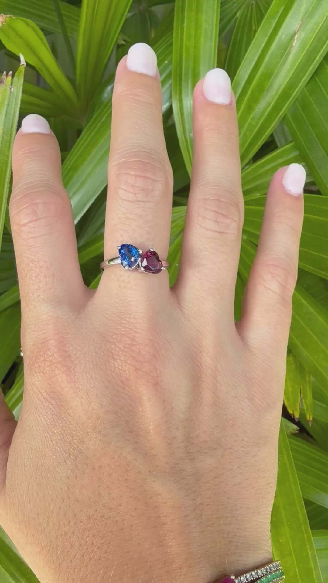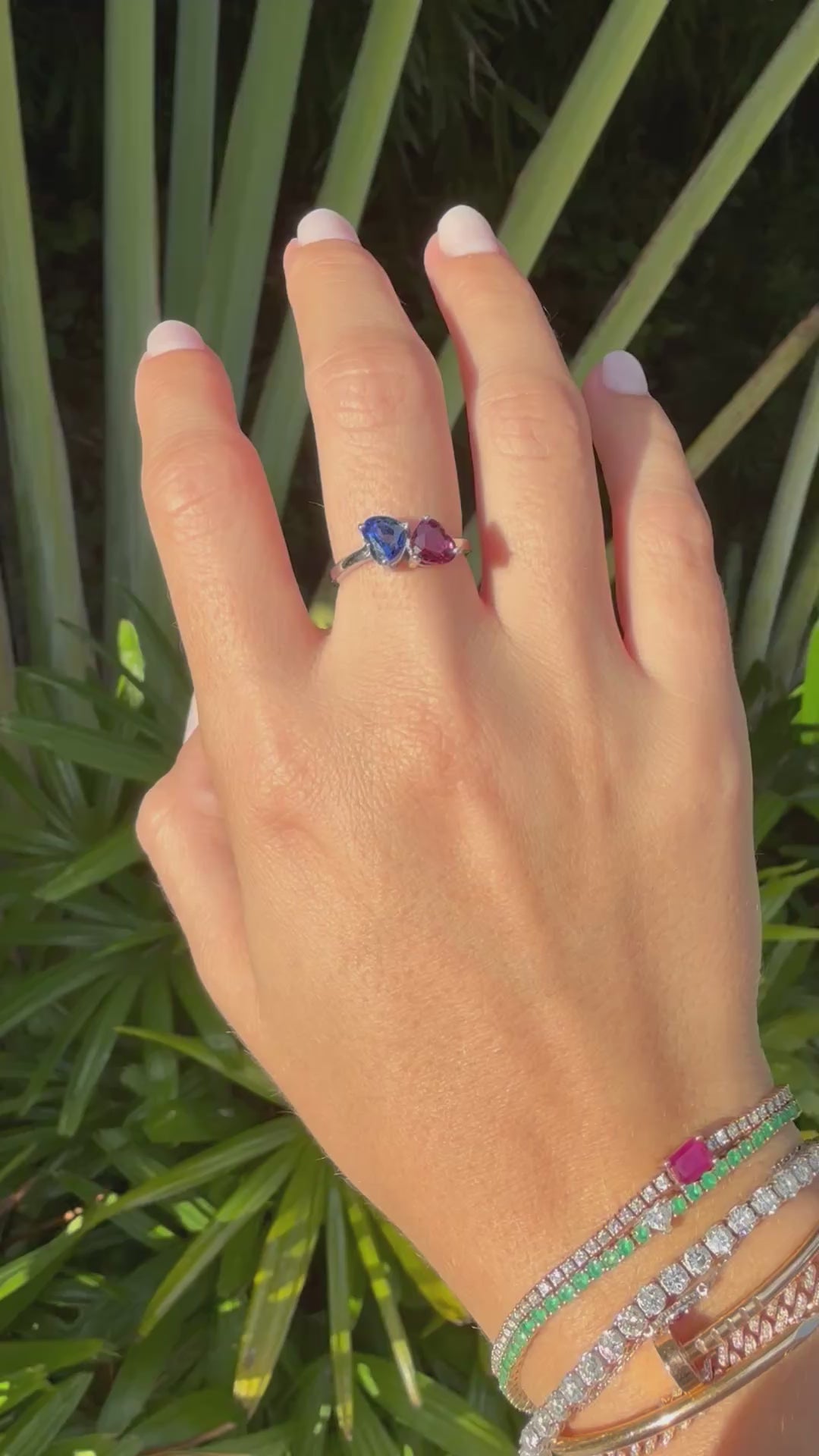 Set in a 18K white gold band, 1.16 ct heart shaped ruby, 1.34 ct heart shaped sapphire.