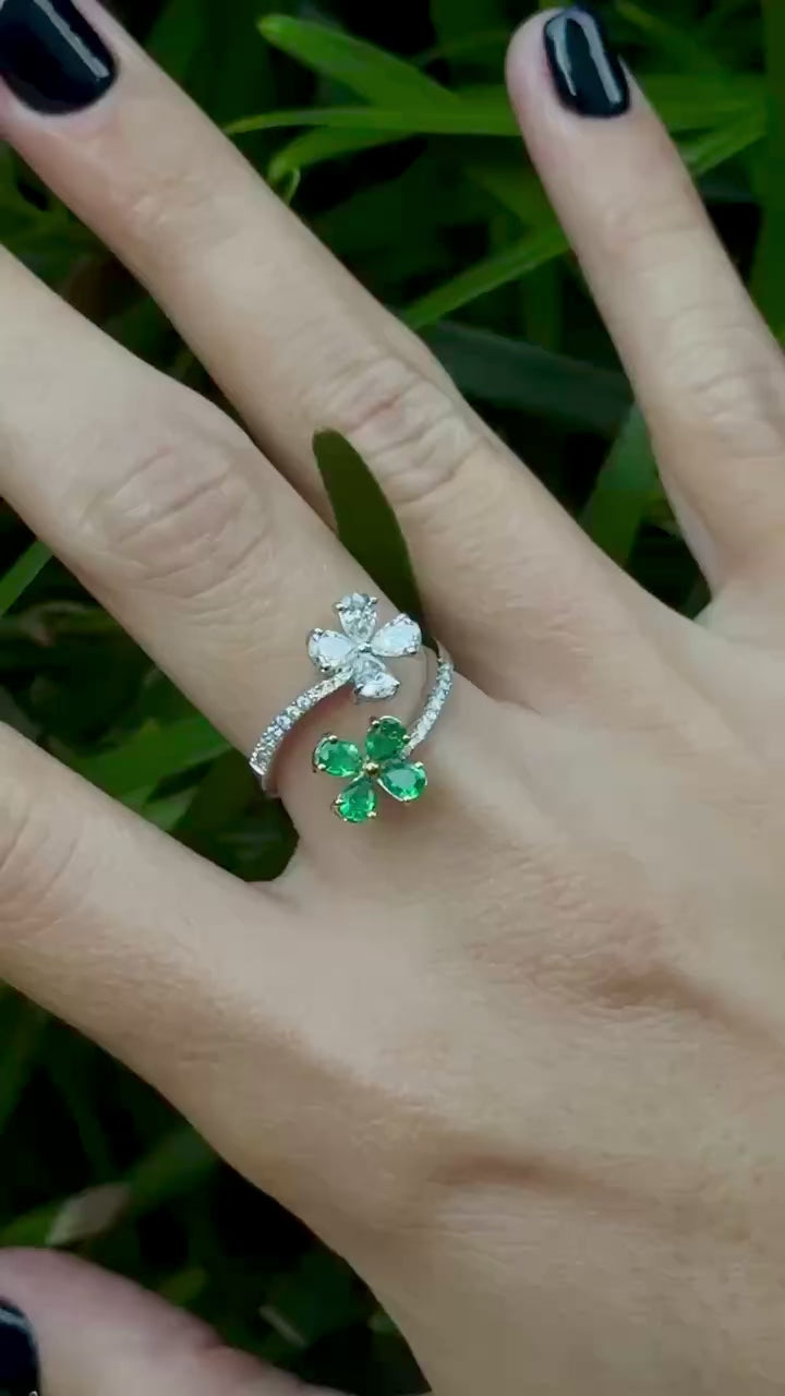 This one of a kind piece is set in 18K white gold with 0.74 ct diamond and 0.41 ct emerald